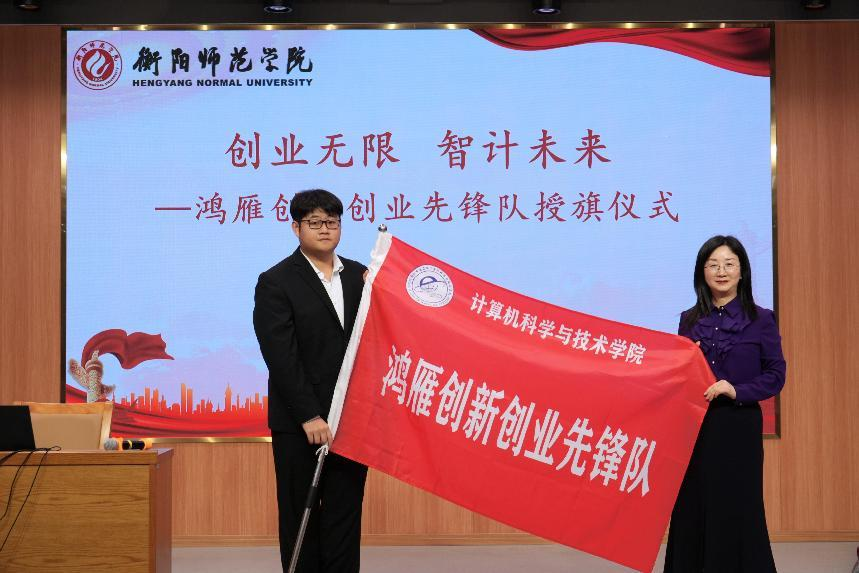 仪式伊始,党总支书记何志红以《立鸿雁之志,创时代新篇》为题发表讲话。她指出,先锋队的成立不仅是学院深化“双创”教育的重要实践,更是计科学子以鸿雁之姿拥抱时代机遇的崭新起点。围绕“鸿雁精神”,何书记提出三点期望:一是以“鸿雁之志”,读懂湖南省“七个一”创业政策机遇,把握时代风口;二是以“领头雁”引领“雁阵群”,在时代答卷中积极担当作为;三是将校训“厚德博学,励志笃行”融入创业实践,传承湖湘敢为人先的精神血脉,在时代的苍穹下“书写属于中国青年的壮美轨迹”。致辞结束后,何志红书记为鸿雁先锋队授旗,大队长罗浚誉庄重地接过旗帜,标志着计算机科学与技术学院鸿雁大学生创新创业先锋队正式起航。