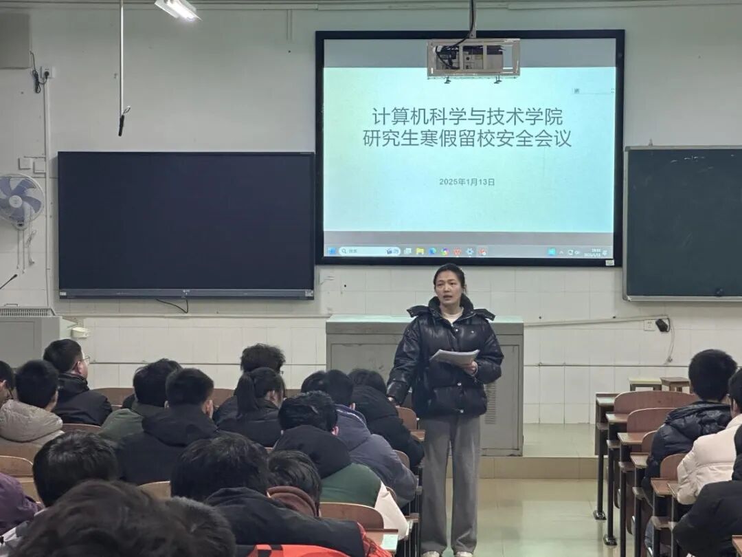 为切实做好寒假留校研究生的安全教育工作,提高留校学生的安全防范意识,2025年1月13日晚上,计算机科学与技术学院在计科楼211召开寒假留校研究生安全工作会议。本次会议由辅导员陈小燕主持,全体留校研究生参加了会议。